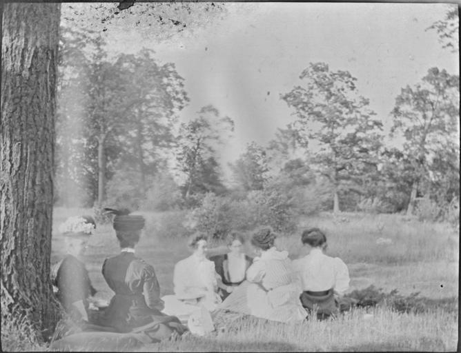 | Keywords: women clothes hats trees 1900s blackandwhite monochrome outdoor black and white "Eagle Hill - afternoon tea, July" Photograph of six women underneath a tree, taken July 1908. Slightly water-damaged. "Eagle Hill - afternoon tea, July" Photograph of six women underneath a tree, taken July 1908. Slightly water-damaged. |