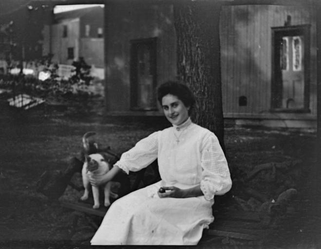 | Keywords: women clothes 1900s animals cats blackandwhite monochrome people black and white "Marjorie R. & Cat, Aug. '08" Marjorie Rathbun (1891-1966), the photographer's younger sister, sitting on the bench that is also visible in HMR2-09-38b. The photograph was taken in the garden of the Rathbun family's house on Main Street, Deseronto, Ontario. "Marjorie R. & Cat, Aug. '08" Marjorie Rathbun (1891-1966), the photographer's younger sister, sitting on the bench that is also visible in HMR2-09-38b. The photograph was taken in the garden of the Rathbun family's house on Main Street, Deseronto, Ontario. |