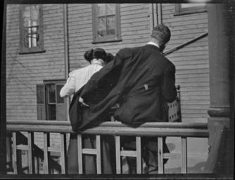 | Keywords: 1900s houses men clothes women blackandwhite monochrome black and white "Marvin & Betty Caldwell, Apl. 11/09" Rear view of the photographer's brother, Marvin Rathbun and Betty Caldwell. One of a series of photographs taken on the veranda of the Rathbun house in Main Street, Deseronto, Ontario, on 11 April 1909. "Marvin & Betty Caldwell, Apl. 11/09" Rear view of the photographer's brother, Marvin Rathbun and Betty Caldwell. One of a series of photographs taken on the veranda of the Rathbun house in Main Street, Deseronto, Ontario, on 11 April 1909. |