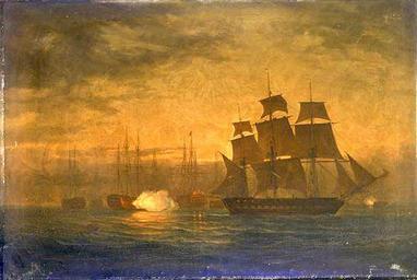 | Keywords: HMS Clyde escapes.jpg en Escape of HMS 'Clyde' from the Nore mutiny 30 May 1797 The 'Clyde' in starboard-broadside view is sailing on the starboard tack and occupying the right-hand side of the picture Beyond her stern and to the left is the 'Sandwich' port-quarter view with the red flag of mutiny at her main and her riding lights lit To the left of the 'Sandwich' in starboard-quarter view is a two-decker firing one of her after upper-deck guns Other ships lie at anchor beyond her and in the right background under 'Clyde's' jib-boom is a frigate firing a gun from her port tier The painting is one of two commemorating the Clyde's escape from the Nore under her captain Charles Cunningham The second shows her arriving at Sheerness the following morning http //www nmm ac uk/collections/displayRepro cfm reproID BHC0496 picture 1 content Collections of the National Maritime Museum William Joy 1830 PD-old Sailing ships of the Royal Navy 19th-century sailing ships in paintings Ships under sail |