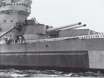 | Keywords: HMSHoweBTurretSydney1944.jpg AWM caption SYDNEY NSW 1944-12-17 DETAIL VIEW OF THE TWIN 14 INCH MARK VII GUNS IN THE MARK II TWIN TURRET ON THE BATTLESHIP HMS HOWE NOTE THE EIGHT BARRELLED 2 POUNDER AA MOUNTING ON THE TURRET CROWN 20 MM OERLIKON AA GUNS ARE MOUNTED ABREAST THE TURRET BARBETTE AND THE BRIDGE NOTE THE SHIP'S BADGE ON THE FACE OF THE BRIDGE THE ARMOURED BELT ON THE HULL IS PROMINENT <br>Comment The photograph shows B turret with 2 14 inch Mk VII guns 302409 NAVAL HISTORICAL COLLECTION 1944-12-17 Photographer not identified PD-AustraliaGov DEFAULTSORT Howe BL 14 inch Mk VII naval gun HMS Howe 32 Howe Black and white photographs |