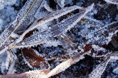 Keywords: hoarfrost leaves autumn winter cold transition frozen sun melt sugar crystals white transparent nature macro