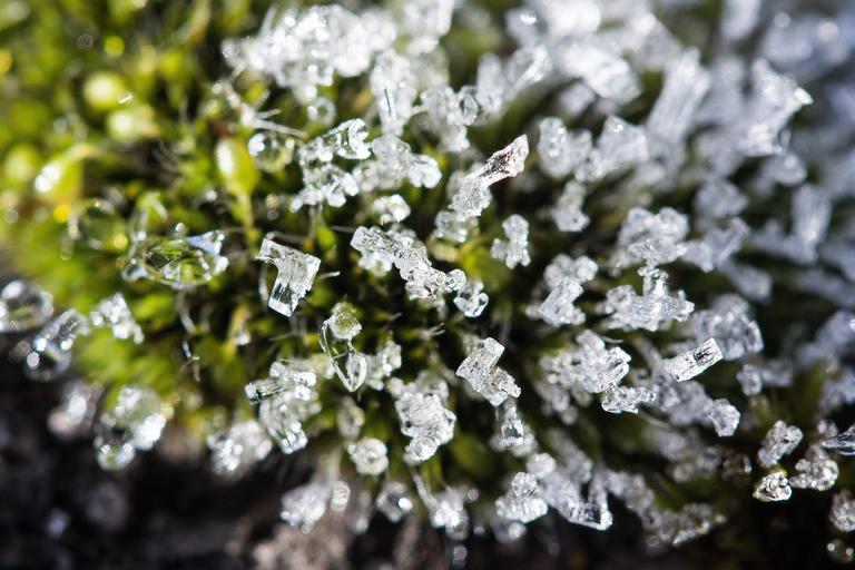 Keywords: hoarfrost moss winter snow cold transition autumn frozen sugar melted crystals green white transparent nature plant flora