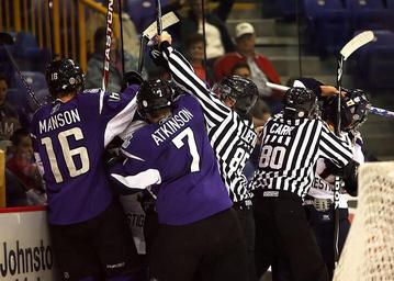 Keywords: hockey referee hockey referees fight altercation penalty sport player ice activity hockey stick helmet game hockey player ice hockey rink team action stick arena hockey rink men athlete sports officials zebras