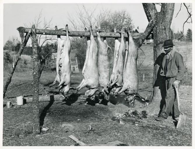 | Keywords: Hog killing Halifax County Marion Post Wolcott 1939.jpeg en Hog killing on Milton Puryeur place; He is a Negro owner of five acres of land; Rural Route No 1 Box 59 Dennison Halifax County Virginia; This is six miles south on Highway No 501 of South Boston; He used to grow tobacco and cotton but now just a subsistence living; These hogs belong to a neighbor landowner; He burns old shoes and pieces of leather near the heads of the slaughtered hogs while they are hanging to keep the flies away Photograph by Marion Post Wolcott from the U S Farm Security Administration courtesy of the New York Public Library Digital Collection http //digitalgallery nypl org/nypldigital/id 1260089 Creator Marion Post Wolcott 1939-11 PD-USGov Marion Post Wolcott Halifax County Virginia Agriculture in Virginia |