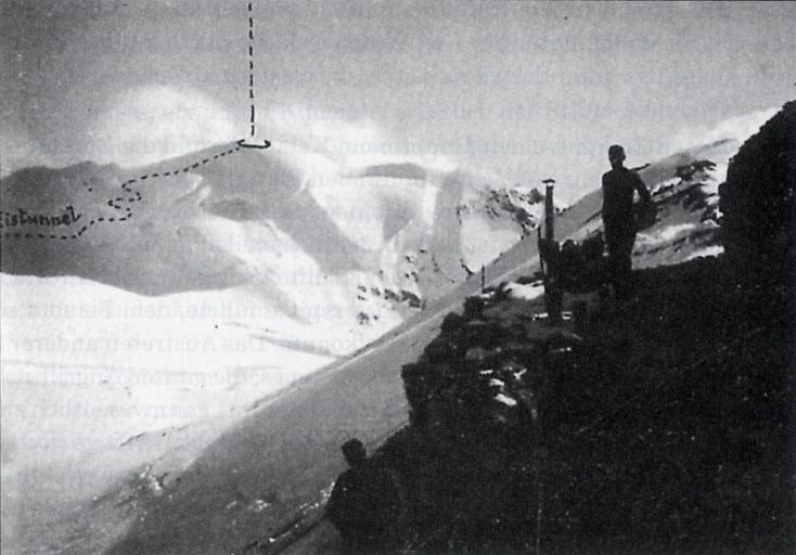 | Keywords: Hohe Schneide Eistunnel.jpg en The tunnel to the summit of Hohe Schneide/Monte Cristallo through which the mountain was conquered 1917 de Verlauf des Angriffsstollens auf die Hohe Schneide/Monte Cristallo 1917 Lempruch Der König der deutschen Alpen und seine Helden author published 1925 The author of the book where the photo was published tried to find out the author of each photo and provided the names unless he failed to establish one like in this case See Commons Deletion requests/File Hohe Schneide Eistunnel Eingang jpg Anonymous-EU Hohe Schneide Italian Front theatre of World War I Winter and mountain warfare Black and white photographs |