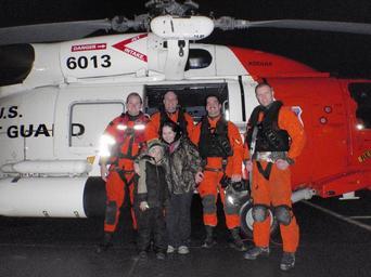 | Keywords: Hoist of two from Ugak Bay on Kodiak Island DVIDS1099199.jpg en KODIAK Alaska - Coast Guard Petty Officer 3rd Class Chris Moore left Lt Cmdr Craig Neubecker Lt Vincent Jansen Petty Officer 1st Class Keith Bastman along with Candice Lotzer and her son pose next to an MH-60 Jayhawk helicopter at Air Station Kodiak after being hoisted from Ugak Bay on Kodiak Island Nov 21 2010 Lotzer and her son were on a hunting trip with Shane Lotzer and Chul Gibbs and needed to be hoisted after their skiff became grounded by low tide U S Coast Guard video by Air Station Kodiak 2010-11-21 https //www dvidshub net/image/1099199 1099199 2013-12-12 06 51 KODIAK AK US PD-USGov Air Station Kodiak Images from DoD uploaded by Fæ |