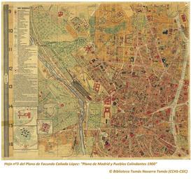 | Keywords: Hoja3 Plano FacundoCL.jpg es Hoja 3 del Plano de Madrid en 1900 dibujado por Facundo Cañada Descripción física del plano total por el autor El plano consta de 6 hojas cada una de las cuales mide 59 cm de altura por 72 cm de ancho de trabajo por supuesto nada de anchos de cenefas y por lo tanto al unirlas forman un plano que mide 1 44 metros de ancho y 1 77 de alto y las márgenes en blanco se está tirando escrupulosamente en ocho colores y en superior papel hallándose perfectamente grabado Facundo Cañada López 1900 Descripción cartográfica del plato total Plano de Madrid y Pueblos colindantes de Aravaca Canillas Canillejas Carabanchel Alto Carabanchel Bajo Chamartín El Pardo Real Sitio Fuencarral Getafe Hortaleza Leganés Pozuelo de Alarcón con sus barrios de Húmera y Estación; Vallecas Vicálvaro Villaverde etc al principiar el siglo XX El plano va acompañado de una Guía con el Directorio de Madrid y otras notas aclaratorias Información estadística y nomenclator del plano por el autor La superficie del término municipal de Madrid de la época es de 821 189 581 pies cuadrados equivalentes a 18 621 fanegas del marco de Madrid o sean 6475 hectáreas y 54 áreas; resultando de dicha superficie una proporción de 120 52 metros cuadrados por habitante pues estos son 528 984 según el último empadronamiento general verificado en 1º de Diciembre de 1900 En el plano se fijan los nombres de las plazas calles callejones cuestas etc que en la actualidad tienen detallándose la numeración que a cada casa corresponde dentro de cada manzana pues se fijan los primeros y últimos números de cada una de éstas al principiar las calles y después los últimos en las manzanas sucesivas y de esta manera resulta toda la numeración de cada calle 1900 http //idehistoricamadrid org/hisdimad/documents/plano html Facundo Cañada PD-Scan PD-old-auto-1923 1913 cc-zero PD-old-auto 1913 Plano de Madrid y pueblos colindantes al empezar el siglo XX |