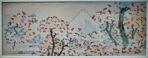 View Original:hokusai_view_mount_fuji_between_flowerin_trees.jpg (2600x1013)