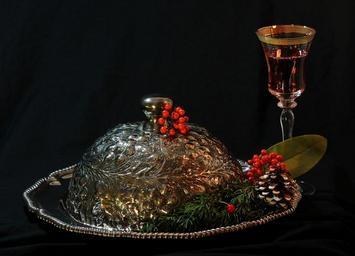Keywords: holiday still life christmas party edwardian silver repousse cover lid tiffany tray decorations juniper berries wine glass metal old fashioned
