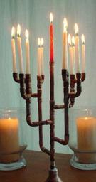 Keywords: Holly Days Menorah.jPG en 13 candle candelabra known as a Holly Days Menorah The image is of one made from 1/4 inch copper pipe with 12 candle positions to be lit on each of the 12 nights of Holly Days and one central Shamus candle Build by Anine Booth own Nesdon 2009-12-20 Cc-zero Menorah Candle chandeliers
