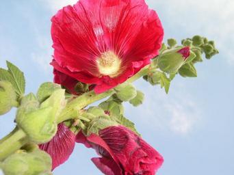 Keywords: hollyhock blue sky button red