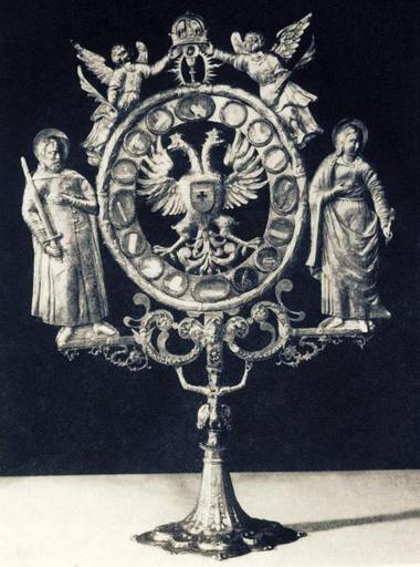 | Keywords: Holy Cross Reliquary.jpg Reliquary for a piece of wood from the Holy Cross Relikwiarz drzewa Krzyża Świętego Silver gilt cm 71 5 49 22 Kraków Treasury of the Dominican Monastery Wedding gift to Władysław IV and Cecilia Renata of Austria Decoration imperial double-headed eagle Władysław IV was elected Tsar of Russia figures of St Ladislaus in Polish costume and St Cecilia Object history ProvenanceEvent 1637 commission Rafał Mikołaj Korsak Uniate Metropolitan Archbishop of Kiev ProvenanceEvent 1637 gift Władysław IV of Poland Rafał Mikołaj Korsak ed Andrzej Fischinger 1976 Sztuka dworu Wazów w Polsce Katalog wystawy 1637 Hornus Reutel Vilnius Copyright expired PD-Art Other versions Photo Photo ed Andrzej Fischinger 1976 Sztuka dworu Wazów w Polsce Katalog wystawy author < 1976 Scratches removed cropped brightness/contrast PD-Polish Anonymous-EU History of Vilnius Relics from the Polish Vasa Collection Trinity Church in Kraków Holy Cross Reliquaries in Poland |