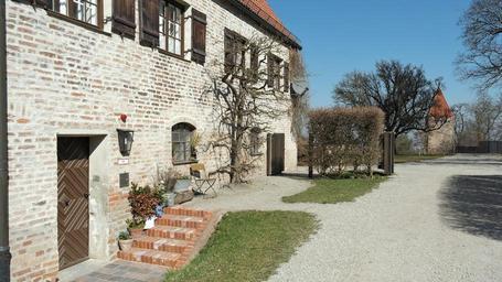 Keywords: home building facade old building truss historically spring tree bush flowering twig away