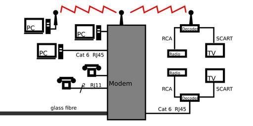 Keywords: Home connections glas.svg en How to connect telephone radio television internet via glass fibre own Handige Harrie 2010-01-09 PD Telephone diagrams Internet access Radio Television