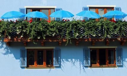 Keywords: home front balconies summer parasols facade balcony flowers decoration hausdeko housewife window