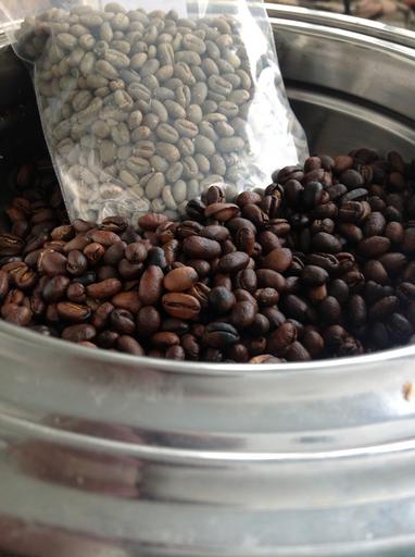 Keywords: home roasted coffee roasted coffee beans full city roast coffee roast coffee and unroasted beans home roasting coffee beans in silver bowl