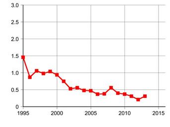 | Keywords: Homicide Rate in Singapore.svg en Homicide rate per 100 000 in Singapore Data taken from http //www indexmundi com/facts/singapore/homicide-rate 2016-08-17 own Delphi234 other versions current annually Generated with Wikimedia SVG Chart SVG Chart/box cc-zero Homicide rates Crime in Singapore Diagrams labelled with numbers only |