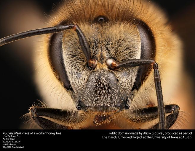 30.i.2016 A.M.Esquivel bees honeybee antennae hymenoptera compoundeyes apismellifera apidae pollinators insectfaces socialinsects Honey bee (24449818589).jpg USA TX Travis Co Austin 182m 30 320N -97 682W Interior house 30 i 2016 A M Esquivel https //www flickr com/photos/131104726 N02/24449818589/ Honey bee 2016-02-04 11 36 https //www flickr com/people/131104726 N02 Insects Unlocked from USA cc-zero insectsunlocked https //flickr com/photos/131104726 N02/24449818589 2016-05-13 17 34 44 cc-zero Photographs by Insects Unlocked Images uploaded by Natuur12 from Flickr Apis mellifera |