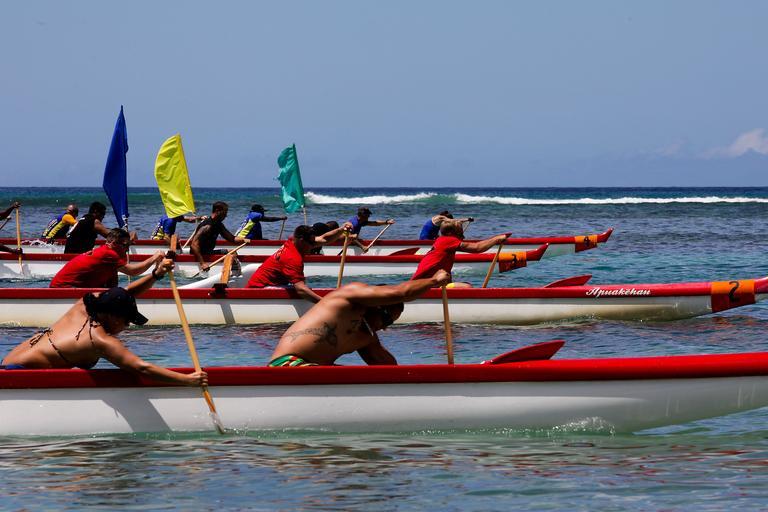Keywords: honolulu hawaii ocean sea water men women racing canoes canoe nature outside competition exercise sky tropics tropical