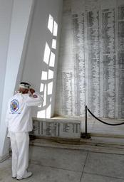 | Keywords: Honoring the memory of Pearl Harbor DVIDS134836.jpg en Woody Derby a survivor of the attack on Pearl Harbor salutes the names of the deceased at the USS Arizona Memorial during a Prayer for Peace ceremony sponsored by the Japan Religious Committee for World Federation The prayer ceremony followed a joint U S Navy/National Park Service ceremony commemorating the 67th anniversary of the attack on Pearl Harbor The theme of this year's historic commemoration Pacific War Memories The Heroic Response to Pearl Harbor emphasizes the brave efforts of those who fought at sea on land and in the air to turn the tide in the Pacific More than 2 000 distinguished guests and the general public joined service members Pearl Harbor survivors and their families and friends for the annual observance 2008-12-07 Jay Pugh https //www dvidshub net/image/134836 081207-N-+++++-215 2008-12-10 00 24 PEARL HARBOR HI US PD-USGov-Military-Navy USS Arizona Memorial interior Images from DoD uploaded by Fæ |