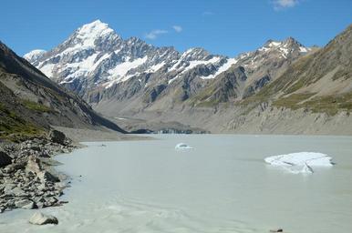 Keywords: Hooker Glacier Lake near its outlet.jpg Hooker Glacier Lake near its outlet Hooker River Own 2016-01-04 Pseudopanax wikipedia en 43 41 18 65 S 170 5 59 7 E Hooker Lake Aoraki/Mount Cook Icebergs in glacial lakes