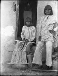 | Keywords: Hopi men preparing warp for weaving a dress, Arizona, ca.1898 (CHS-4573).jpg en <br> Hopi men preparing warp for weaving a dress Arizona ca 1898 Photograph of Hopi men preparing warp for weaving a dress Arizona ca 1898 One Hopi man sits on a doorstep at left holding the warp The other man stands next to him with his hand on his hip They both have long straight hair and wear similar clothes They have long-sleeved shirts with different printed designs and light-colored loose-fitting trousers The stucco around the door frame in which the first man sits is cracked Call number CHS-4573 Photographer James George Wharton Filename CHS-4573 Coverage date circa 1898 Part of collection California Historical Society Collection 1860-1960 Format glass plate negatives Type images Part of subcollection Title Insurance and Trust and C C Pierce Photography Collection 1860-1960 Repository name USC Libraries Special Collections Accession number 4573 Microfiche number 1-168-; 1-163- Archival file chs_Volume96/CHS-4573 tiff Repository address Doheny Memorial Library Los Angeles CA 90089-0189 Geographic subject country USA Format aacr2 2 photographs glass photonegative photoprints b w ; 22 x 17 cm 21 x 26 cm 16 x 21 cm Rights Digitally reproduced by the USC Digital Library; From the California Historical Society Collection at the University of Southern California Subject adlf tribal areas Project USC Repository email specol usc edu Identifying number unidentified no James-20 Contributing entity California Historical Society Date created circa 1898 Publisher of the digital version University of Southern California Libraries Format aat photographic prints; photographs Geographic subject state Arizona Legacy record ID chs-m16905; USC-1-1-1-13518 Access conditions Send requests to address or e-mail given Phone 213 821-2366; fax 213 740-2343 Subject file heading Indians -- Hopi -- General Subject lcsh Indians of North America; Hopi Indians Subject Hopi Indians; Hopi Indians -- Blanket making etc ; Hopi Indians circa 1898 date created George Wharton James 1858 1923 http //digitallibrary usc edu/cdm/ref/collection/p15799coll65/id/16827 PD-old-70-1923 Images from USC Digital Library uploaded by Fæ Photographs by George Wharton James California Historical Society Collection 1860-1960 Glass plate negatives Hopi men |