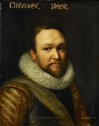 | Keywords: portrait people Horace Vere (1565–2 May 1635) (also Horatio Vere or Horatio de Vere) was an English military leader during the Eighty Years' War and the Thirty Years' War, a son of Geoffrey Vere and brother of Francis Vere. He was sent to the Palatinate by James I in 1620. He was created Baron Vere of Tilbury, and died without male heir. Sir Horace was a professional soldier, even-tempered, brave and popular. The Earl of Essex was one of his lieutenants, and the Earls of Warwick, Peterborough, and Bedford served under him, as did the royalist soldiers Lords Grandison, Byron, and Goring. A large number of Englishmen who were afterwards distinguished soldiers served under Vere in the trenches at Den Bosch. Among them were: Thomas Fairfax and Philip Skippon, the future organisers of the New Model Army; Jacob Astley, Thomas Glemham, the future royalist generals; Sir John Borlase, and Henry Hexham, the historian of the Dutch wars. Fairfax, Skippon, and George Monck, particularly, were his pupils in the art of war. The fourth son of Geoffrey Vere by his wife Elizabeth Hardekyn[2], and younger brother of Sir Francis Vere, he was born in 1565. He left his home at Kirby in 1590 to join his two elder brothers, Robert and Sir Francis, in the Netherlands, commencing his service in the infantry company of the latter during his tenure of office as sergeant-major-general. He was wounded during the assault by English and Dutch soldiers on the fortress of Steenwijk on 5 July 1592, was recommended by his brother for a company at the siege of Groningen in June 1594, and was knighted for his gallantry at the siege of Cadiz in June 1596.[1] He commanded three hundred foot at the battle of Nieuwport under his brother, after whose retirement from the field he helped Sir John Ogle and Sir Charles Fairfax to rally the English vanguard ; and at the siege of Ostend he took a conspicuous part in the repulse of the Spanish assault on 7 January 1602, being stationed (along with Fairfax) at a vital point in the defences known as the 'Sandhill,' in command of twelve companies. He was badly hurt in the leg by a splinter. Early in April 1603 he was despatched by his brother with a message to the new king. After the surrender of Maastricht, Vere returned to England. While dining with Sir Harry Vane, The Hague envoy and his diplomatic friend, at Whitehall on 2 May 1635, he was seized with an apoplectic fit and died within two hours. He was buried with military pomp on 8 May in Westminster Abbey, where the same tomb serves for him and his brother, Francis. Vere married, in October 1607, Mary, daughter of Sir William Tracy, kt., of Toddington, Gloucestershire, and widow of William Hoby. With his death the barony of Vere of Tilbury became extinct. He left five daughters, who were his coheirs:[1] 1. Elizabeth, who married John Holles, 2nd Earl of Clare, grandfather of the first Duke of Newcastle; 2. Mary, who married, first, Sir Roger Townshend, bart., of Raynham in Norfolk, whence are descended the Marquises of Townshend, and secondly, Mildmay Fane, 2nd Earl of Westmorland; 3. Catherine, who married, first, Oliver St. John of Lydiard Tregoze (Bolingbroke was thus her great-grandson), and, secondly, John, Lord Paulet; 4. Anne, who married I Sir Thomas (afterwards Lord) Fairfax; and 5. Dorothy, who married John Wolstenholme, eldest son of Sir John Wolstenholme, bart., of Nostell, Yorkshire.[1] Lady Vere continued to live at Clapton until the death of the widow of Lord Vere's eldest brother, John, when she succeeded to Kirby Hall, where she died on Christmas Eve 1670, aged 90. For a short while in the spring of 1645, after the death of the Countess of Dorset, the king's children, Elizabeth and Henry, Duke of Gloucester, were entrusted to her care. She was much in Parliament's favour; but (despite the handsome allowance) she transferred it to the Earl and Countess of Northumberland.[1] Vere was a first cousin of Edward de Vere, 17th Earl of Oxford (1550-1604)[2]. According to adherents of the Oxfordian theory that Edward was the author of the works attributed to William Shakespeare, the character of Horatio in Hamlet may have been inspired by Horatio Vere, also because both are known for their ability to remain calm under all conditions. Horace Vere (1565–2 May 1635) (also Horatio Vere or Horatio de Vere) was an English military leader during the Eighty Years' War and the Thirty Years' War, a son of Geoffrey Vere and brother of Francis Vere. He was sent to the Palatinate by James I in 1620. He was created Baron Vere of Tilbury, and died without male heir. Sir Horace was a professional soldier, even-tempered, brave and popular. The Earl of Essex was one of his lieutenants, and the Earls of Warwick, Peterborough, and Bedford served under him, as did the royalist soldiers Lords Grandison, Byron, and Goring. A large number of Englishmen who were afterwards distinguished soldiers served under Vere in the trenches at Den Bosch. Among them were: Thomas Fairfax and Philip Skippon, the future organisers of the New Model Army; Jacob Astley, Thomas Glemham, the future royalist generals; Sir John Borlase, and Henry Hexham, the historian of the Dutch wars. Fairfax, Skippon, and George Monck, particularly, were his pupils in the art of war. The fourth son of Geoffrey Vere by his wife Elizabeth Hardekyn[2], and younger brother of Sir Francis Vere, he was born in 1565. He left his home at Kirby in 1590 to join his two elder brothers, Robert and Sir Francis, in the Netherlands, commencing his service in the infantry company of the latter during his tenure of office as sergeant-major-general. He was wounded during the assault by English and Dutch soldiers on the fortress of Steenwijk on 5 July 1592, was recommended by his brother for a company at the siege of Groningen in June 1594, and was knighted for his gallantry at the siege of Cadiz in June 1596.[1] He commanded three hundred foot at the battle of Nieuwport under his brother,