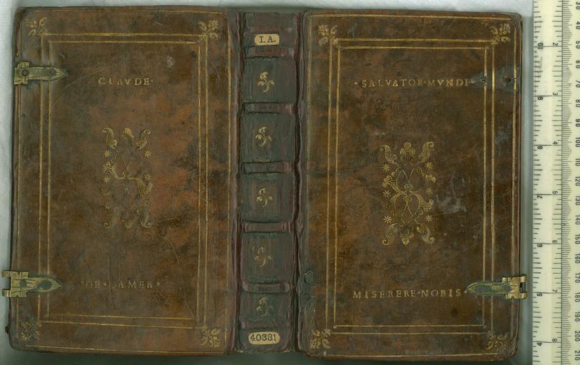 Keywords: Horae- ad usum Parisiensem (Paris) -French and Latin- -Imprint- Paris- Philippe Pigouchet, for Simon Vostre, 23 Dec. 1497 - - - Upper and lower cover and spine (IA.40331).jpg Style Panel design Lettered cover eg intitals titles Centrepiece made of small tools Star Floral Azured or hatched motifs; Caption Upper and lower cover and spine; Colour Brown; Edge Gilt exhibition history Decorative Technique Tooled in gold; Cover Material Calf Format 8° ISTC No ih00352700 BMC VIII 118 The binding has been repaired Wooden boards Traces of 2 pairs of clasps catching on to the upper cover Ink ms notes on the upper free endleaves including a drawing of a coat of arms Lower cover is tooled Claude de Lamer Upper cover Salvator Mundi Miserere Nobis object history Text 1497; Paris; La Mer Claude de object type Cc-zero place of creation Binding France place of discovery Unspecified British Library image http //www bl uk/catalogues/bookbindings/LargeImage aspx RecordId 020-000017925 ImageId ImageId 56800 Copyright BL Horae ad usum Parisiensem Paris French and Latin Imprint Paris Philippe Pigouchet for Simon Vostre 23 Dec 1497 Uploaded with GWToolset Horae ad usum Parisiensem Paris French and Latin Imprint Paris Philippe Pigouchet for Simon Vostre 23 Dec 1497 - Upper and lower cover and spine IA 40331 http //www webarchive org uk/bldatasets/bindings/ia40331 jpg Bookbinding 16th-century bookbinding British Library Bookbindings |