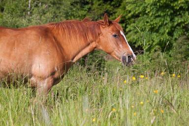 Keywords: horse brown fuchs pasture grass high graze edge of the woods meadow green summer