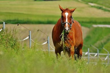Keywords: horse coupling stallion eat paddock brown meadow pasture graze nature grass green play romp