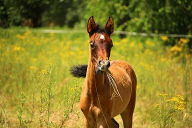 Keywords: horse foal brown mold thoroughbred arabian suckling young animal meadow pasture