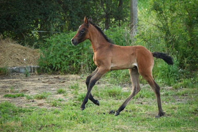 Keywords: horse foal suckling brown mold thoroughbred arabian high spirits buck jump pasture meadow
