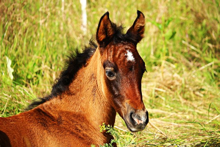 Keywords: horse foal thoroughbred arabian brown mold horse head grass pasture suckling meadow