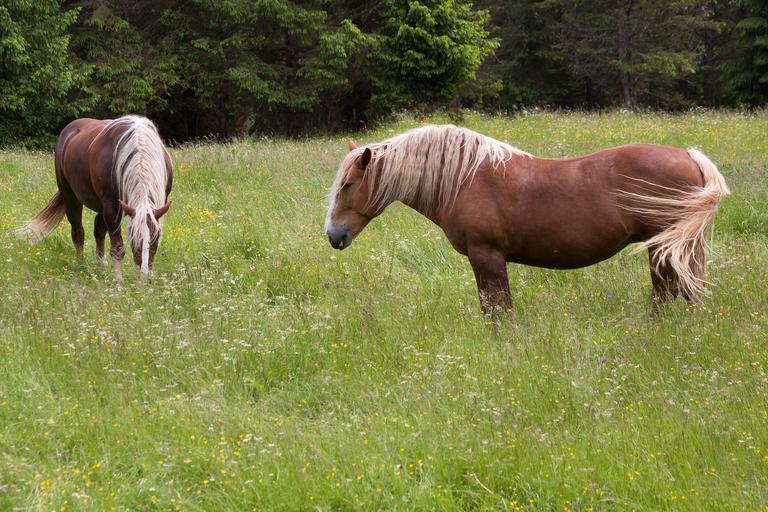 Keywords: horse haflinger pasture meadow graze coupling forest edge of the woods animal world horse head