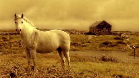 Keywords: horse mold ireland landscape surreal dream editing photoshop nature clouds sky lonely hut atmospheric sepia mood mystical atmosphere mysterious fairytale weird