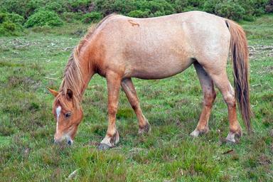 Keywords: horse pony strawberry roan roan new forest pony grazing eating profile standing animal equine mammal nature summer countryside grass green outdoor meadow field rural wild image