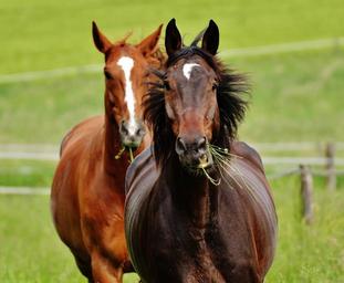 Keywords: horses for two coupling stallion eat paddock brown meadow pasture graze nature grass green play romp