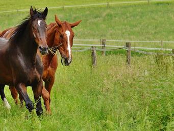 MAKE A MEME View Large Image horses for two coupling stallion eat paddock brown meadow pasture graze nature grass green play romp