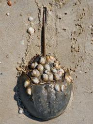 | Keywords: Horseshoe crab with shells 2.JPG en Horseshoe crab with sea shells attached to its shell Photo taken near Villas New Jersey on Delaware Bay Crab was apparently dead when the photo was taken but the tracks in the sand seem pretty fresh 2012-05-29 own Smallbones 39 01 09 N 74 56 50 W cc-zero Limulus polyphemus Delaware Bay Unidentified Mollusca Uploaded with UploadWizard |