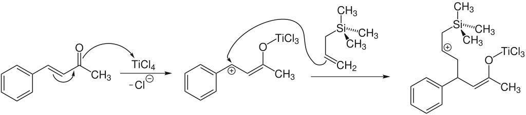 Keywords: Hosomi-Sakurai-Mechanismus 1.svg en Mechanism of the Hosomi-Sakurai-Reaction part 1 de Reaktionsmechanismus der Hosomi-Sakurai-Reaktion erster Teil own Bjö Kra 2011-09-12 Cc-zero Sakurai reaction Reaction mechanisms