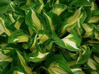 Keywords: hosta garden plant summer spring nature natural foliage leaf leaves variegated striped contrast texture background soft curled