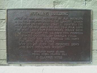| Keywords: Hotaling plaque.jpg en Photograph of a commemorative plaque at 455 Jackson Street in San Francisco California on a building which survived the 1906 earthquake and fire own Scenography 2010-08-20 Words on plaque Hotaling Building Built in 1866 and occupied by A P Hotaling Co this building housed the largest liquor repository on the West Coast It survived the 1906 earthquake and fire due to a mile long fire hose laid from Fisherman's Wharf over Telegraph Hill by the U S Navy This prompted the famous doggerel by Charles Field If as they say God spanked the town for being over frisky why did he burn the churches down and save Hotaling's Whisky Dedicated March 28 1992 Yerba Buena Chapter No 1 E Clampus Vitus cc-zero E Clampus Vitus Hotaling Building |