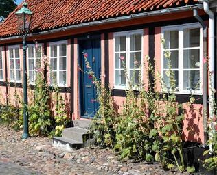 Keywords: house city old bornholm denmark timbered hollyhocks