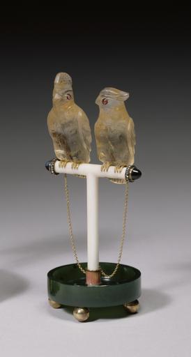 | Keywords: House of Fabergé - Pair of Cockatoos - Walters 571913 - View A.jpg Walters Art Museum artwork Creator House of Fabergé Perched on a T-shaped ivory stand is a pair of topaz cockatoos with ruby eyes and gold feet They are connected by gold chains to a pink enamel and gold mount set in a nephrite base supported by four gold ball feet Carl Fabergé was particularly fond of birds and kept a pet cockatoo early Other date century 20 topaz tourmaline rubies gold ivory enamel nephrite sapphires diamonds cm 10 16 accession number 57 1913 32058 Dr N Dorin Ischlondsky date and mode of acquisition unknown Walters Art Museum Gift of Dr N Dorin Ischlondsky 1961 Objects of Vertu Precious Works of the Eighteenth Century The Walters Art Gallery Baltimore 1984 The Fabergé Menagerie The Walters Art Museum Baltimore; Columbus Museum of Art Columbus; Portland Art Museum Portland 2003-2004 place of origin St Petersburg Russia PD-old-auto 1920 Fabergé animal figurines Collections of the Walters Art Museum Sculptures of birds Topaz objects Tourmaline objects |