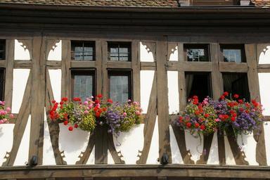 Keywords: house front exterior timber framing traditional old architecture picturesque home window flowers decorative property residence historic structure construction