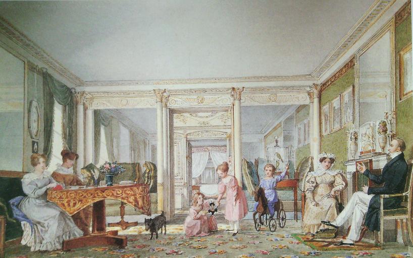 Keywords: House Gagarin.jpg Семья Гага иных изоб ажен князь иколай Се геевич Гага ин 1784-1842 ядом с тещей г афиней А В Боб инской слева за столом его жена - княгиня а ия Алексеевна Гага ина 1796-1835 с гуве нанткой В цент е на ков е иг ающие их дети - а ия Леонилла и иколай скан 1827 Creator Alexander Brullov PD-old-100 House of Gagarin House of Bobrinskiy Alexander Brullov Portraits of parents and children 19th-century family portraits 1820s portrait paintings |