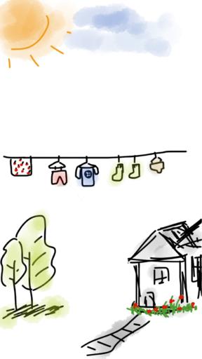 Keywords: house laundry clothes laundry day trees sun sunny outside happy cottage washing towel clean clouds under the sun bathe in sun sunlight green nature road sketch doodle