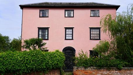 Keywords: house pink home sky building property exterior architecture residential exterior home old home exterior residence housing front entrance door grass roof dwelling hedge green english village