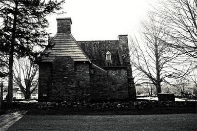 Keywords: house stones roof wall black and white trees